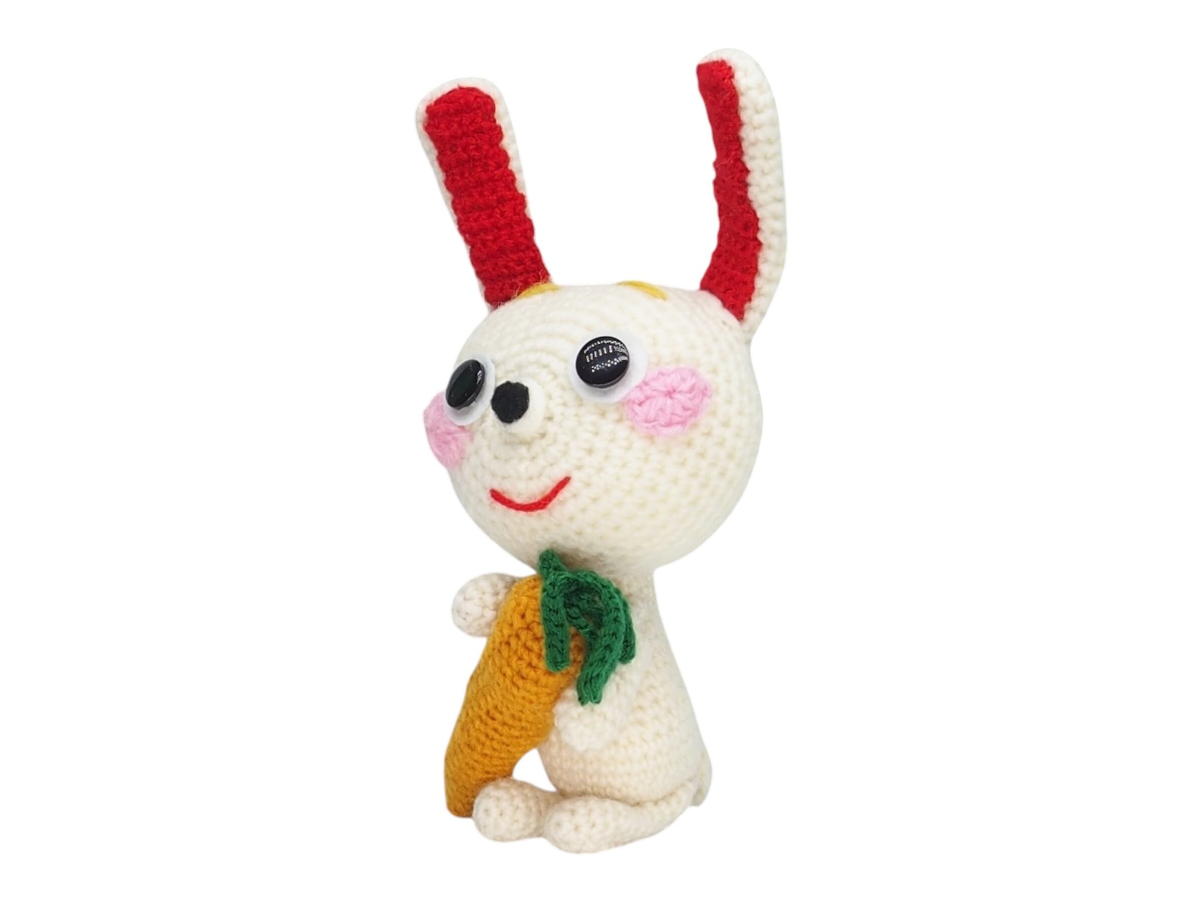 バナナ堂あみぐるみ童謡から飛び出したこの愛らしいうさぎは、にんじんを抱いている姿がとてもキュートです。一つ一つ丁寧に手編みされているため、個性豊かで、世界に一つだけの特別なアイテムとなっています。お部屋のインテリアとして飾るもよし、贈り物としても喜ばれること間違いなしです。